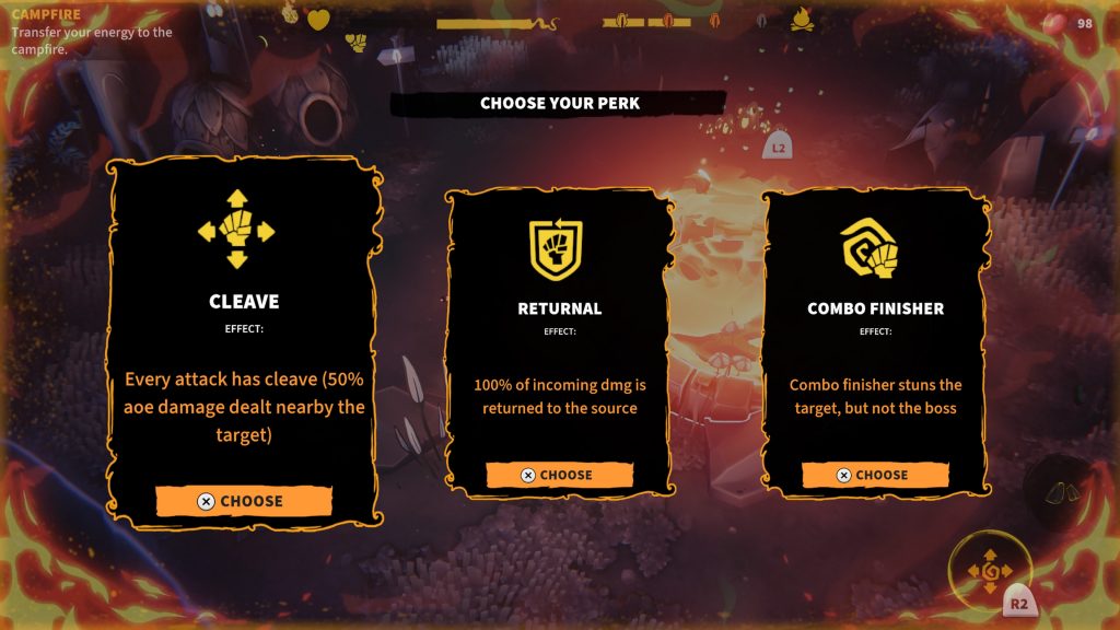 The core gameplay loop is collect flame energy, drop it at a bonfire, get a perk that’ll do you for the rest of your run, then do it again three more times until level completion. Your flame energy is also your life bar, so if you let it get too low and then get into a fight with an enemy, you’ll potentially die in the early stages without really understanding why.