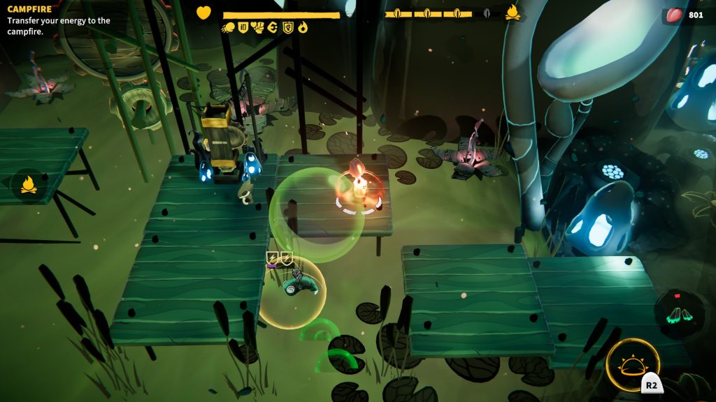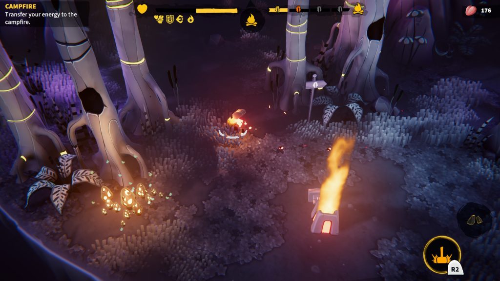 Practically, you’ll have to collect three extra lamps per stage. These allow you to send more of your energy to the bonfires and get more powerups. The game takes place over four distinct biomes: grassy plains, windy plateaus and an icy wasteland. One constant is the bonfires, totems that contain flame energy and enemies to contend with.