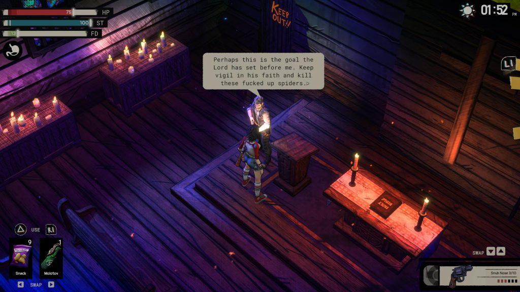 Once you get better weapons, that whole stealth thing goes out of the window, even for bigger enemies. Make sure you’re at full health, throw a molotov, blast the thing with your shotgun and watch it die. If you do get hurt, don’t worry. You’ve got bandages. Combat stops being a big deal until maybe the very last part of the game, where the number of enemies means you might have to do a bit more kiting and healing.