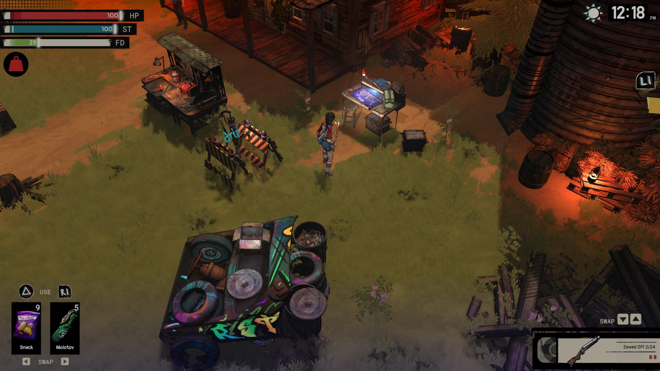 While this is all fairly compelling, there’s just a real lack of polish and quality that threatens to ruin every element of the game. For example, there’s a whole crafting thing where you can make structures in the front yard of the ranch. These can produce materials for making more buildings, weapons, ammo and food. Great. But, no, not great. Most of the buildings are useless. Why? Because you’ll find more than enough ammo and food out on your travels. I never had to make food. I did it to do it, but I only ever ate bags of crisps, and that was enough. I didn’t need to make medicine because I always had enough bandages to heal myself. I never had to make ammo because I always had enough of that. Oh, and to make things worse, there’s a weight limit that eventually stops you being able to run. Not great if you’re in a bunker at the time with no way to offload any of it.