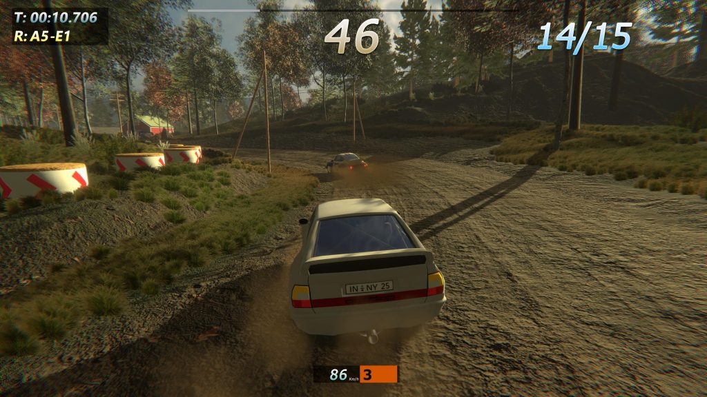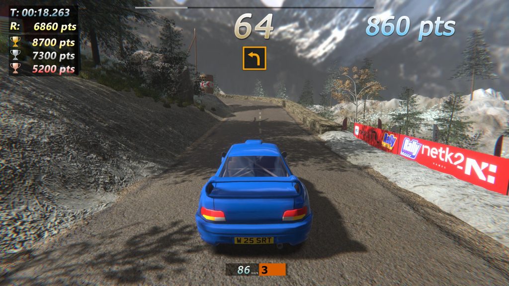 Presentation is competent. As a game with a lighter budget, you can see where the corners are cut. Countdowns and pace notes are one-take sound clips that get the point across. They’re not detailed by any stretch but the gradience of easy to hard corners are simple enough to gauge. There’s no options to alter the timing of these notes and that does lead to situations where they arrive too late to anticipate.