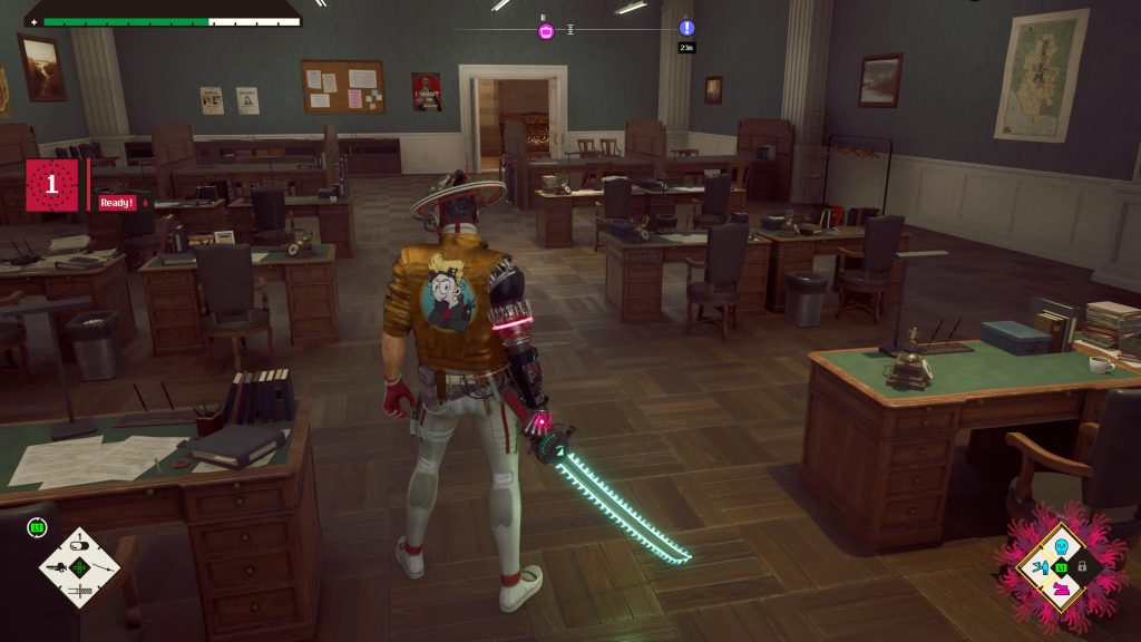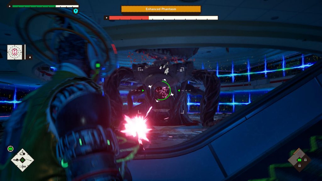 There are a few augmentations to it, though. You get a gun, which is pretty useful but less fun to use. Slow reload times and chip damage mean that it’s not the most efficient or enjoyable way to dispatch enemies. This is more of a problem during boss battles, where you often have to keep your distance, making these bullet-spongey foes a bit of an ordeal to beat.