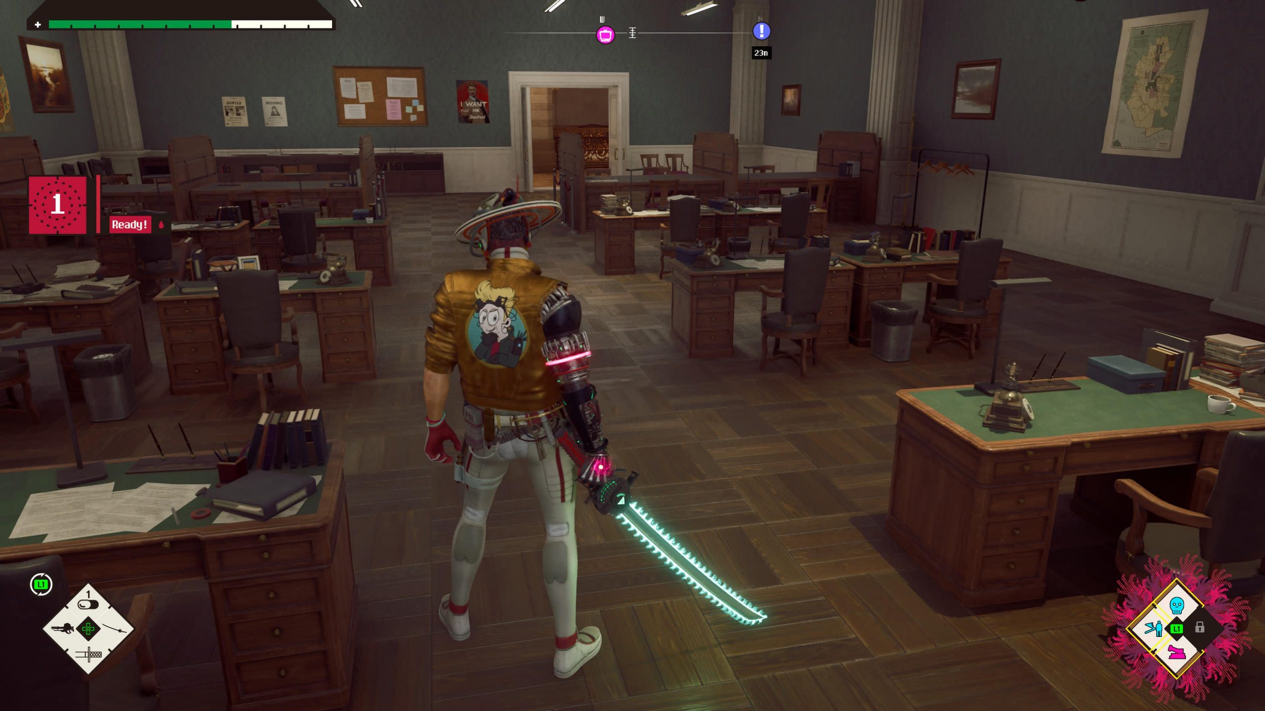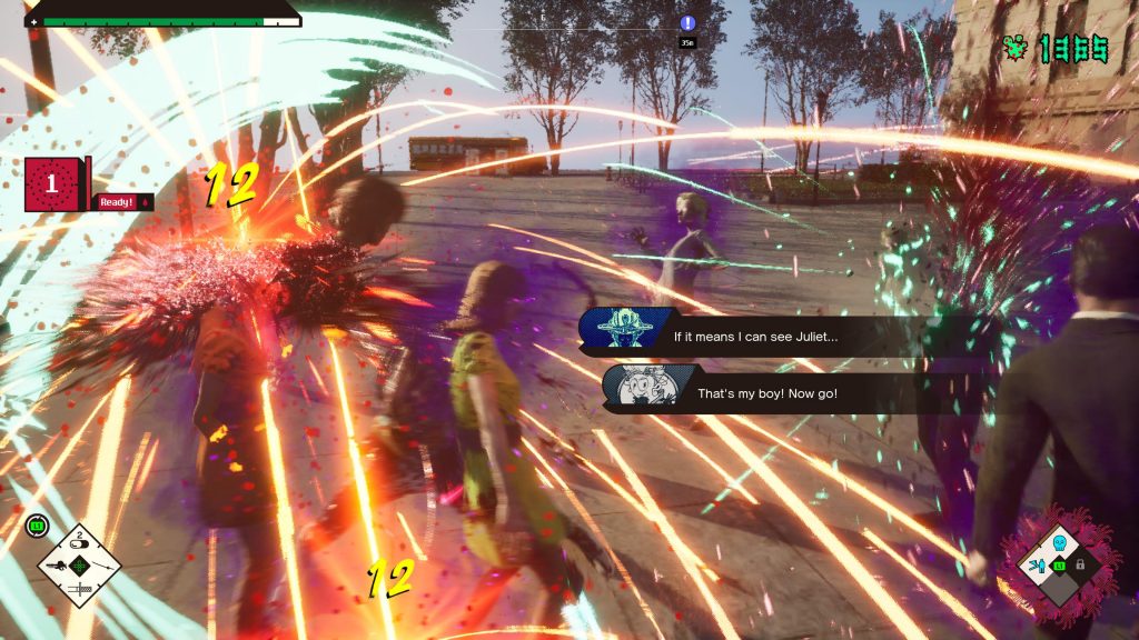 Romeo is a Dead Man does stuff like that. It’s annoying, like many modern games, in that there’s a lot to find out about, little game mechanics that are thrown in because just having a good action game isn’t enough anymore. You need to throw in things. The Bastard Seed stuff, cooking and other elements are included, despite not really having to be, and then explained via text boxes. The thing is, the game throws text boxes at everything. From important plot points to silly banter, from crucial gameplay information to utterly inane drivel. At one point, an NPC recalls an entire play that she saw. It takes far too long and is just there to be quirky. Like we said, performative. It’s all well and good throwing in bits of backstory to give the plot depth, but so much of what you read is unimportant.