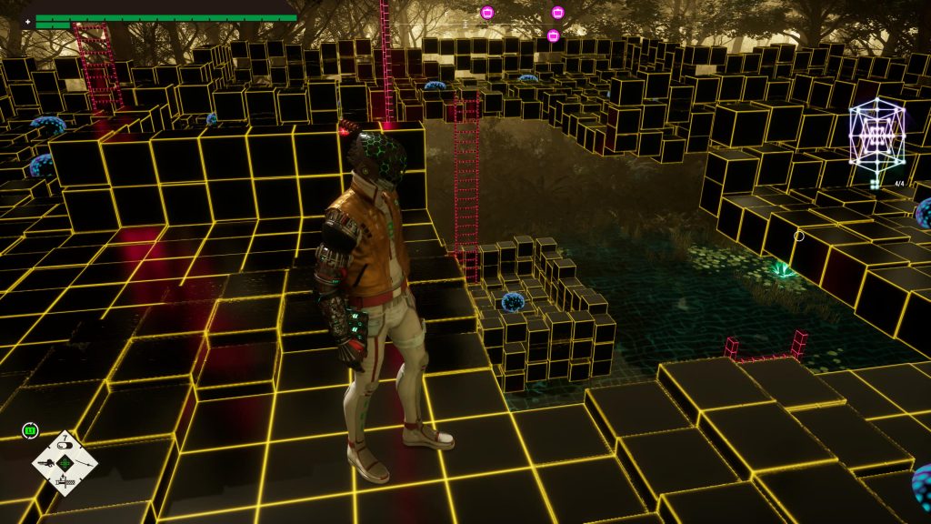 The game’s levels all play out in roughly the same way. You’ll have a large-ish area to run around in where you’ll need to complete some main task, but along the way, you’ll find yourself unable to get to your next objective. At this point, you’ll need to enter ‘Subspace’ via a television (Suda51!), and these areas act as hidden routes, almost like a sewer system, to let you get to other areas in the main part of the level. The issue is that it can all start to get a bit convoluted. The Subspace areas start to feel a bit maze-like and usually their walls rise up to meet you, so that you can’t always easily identify where you’re meant to be going. And it gets a lot worse later on when they introduce more verticality to these sections, compounding the confusion.