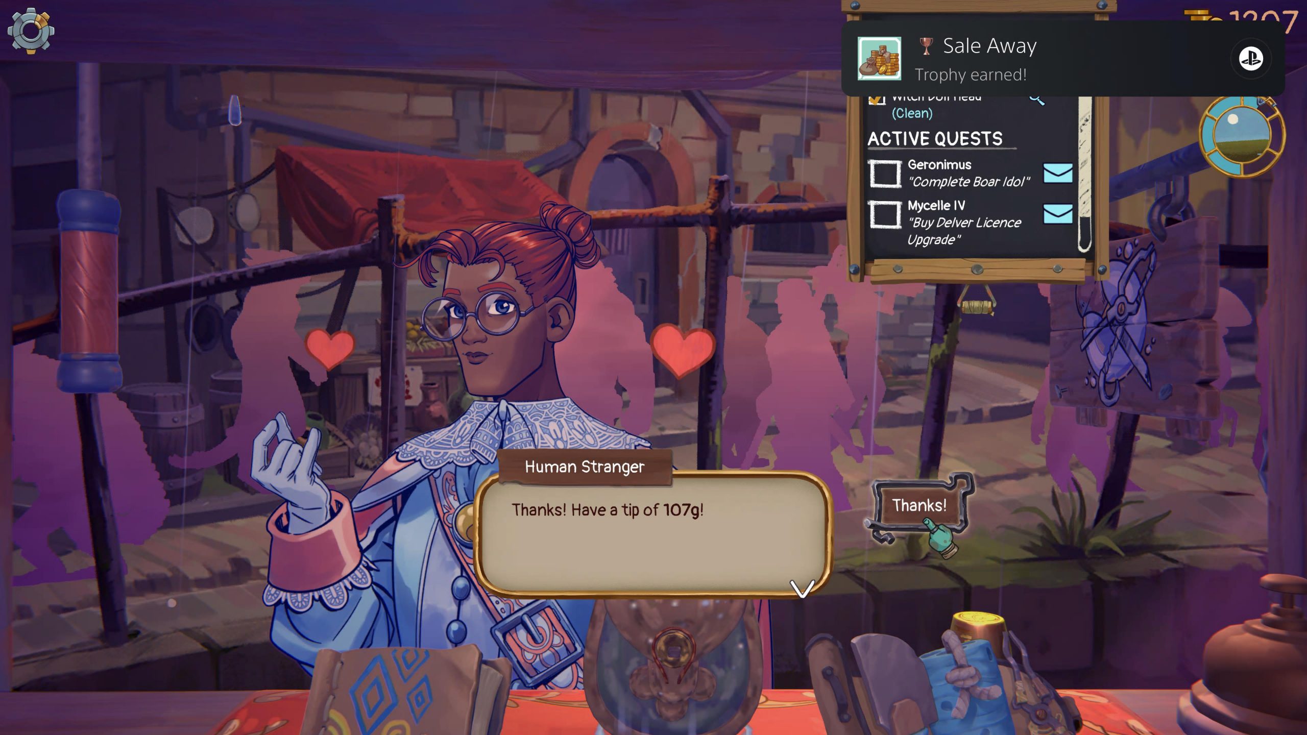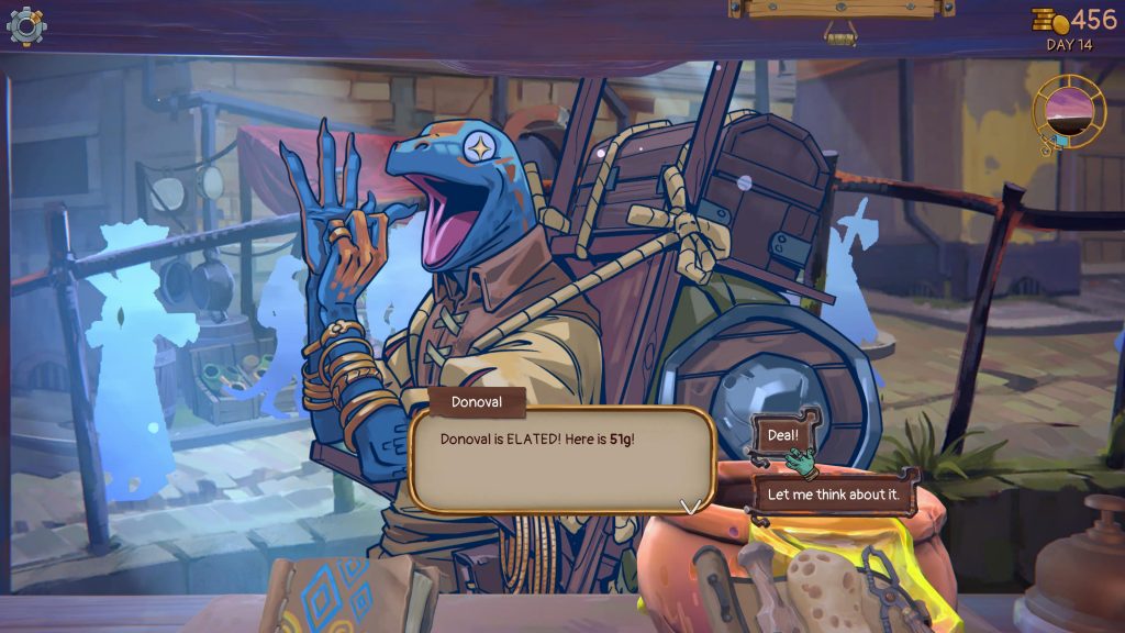 Once you’ve got some items ready to sell, the next most important screen is the shop window. Here you’ll get customers appearing with requests. If you’ve got the item they want, you can sell it immediately. Otherwise, you can decline them or, more importantly, ask them to come back later while you source what you want. That can be by either hoping the item they need shows up (which costs you nothing but isn’t guaranteed) or by ordering it for a price (and therefore a cut of your profit).