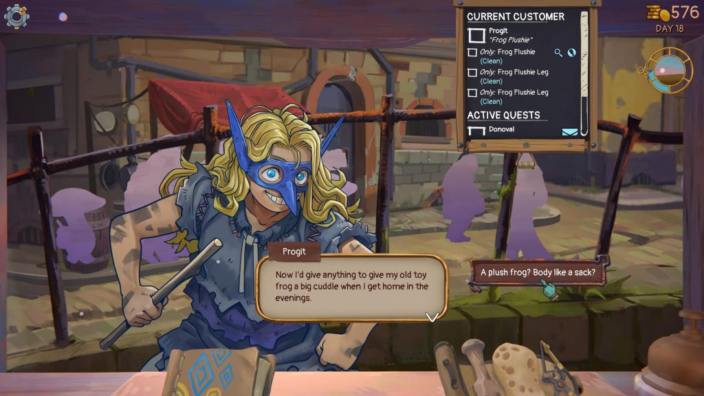 The third area of the shop is the back office. This is where you’ll find Aimon, who will occasionally set story quests or sell you upgraded tools. You can get a more efficient chisel, sponge and upcycler here, and they do help. The upcycler in particular is good because it allows you to combine more items together, which lets you make complete items such as toy plushies which have a body, head and four limbs (you’ll need to upgrade the upcycler five times to make that) or just put unwanted parts on other items to up their selling price.