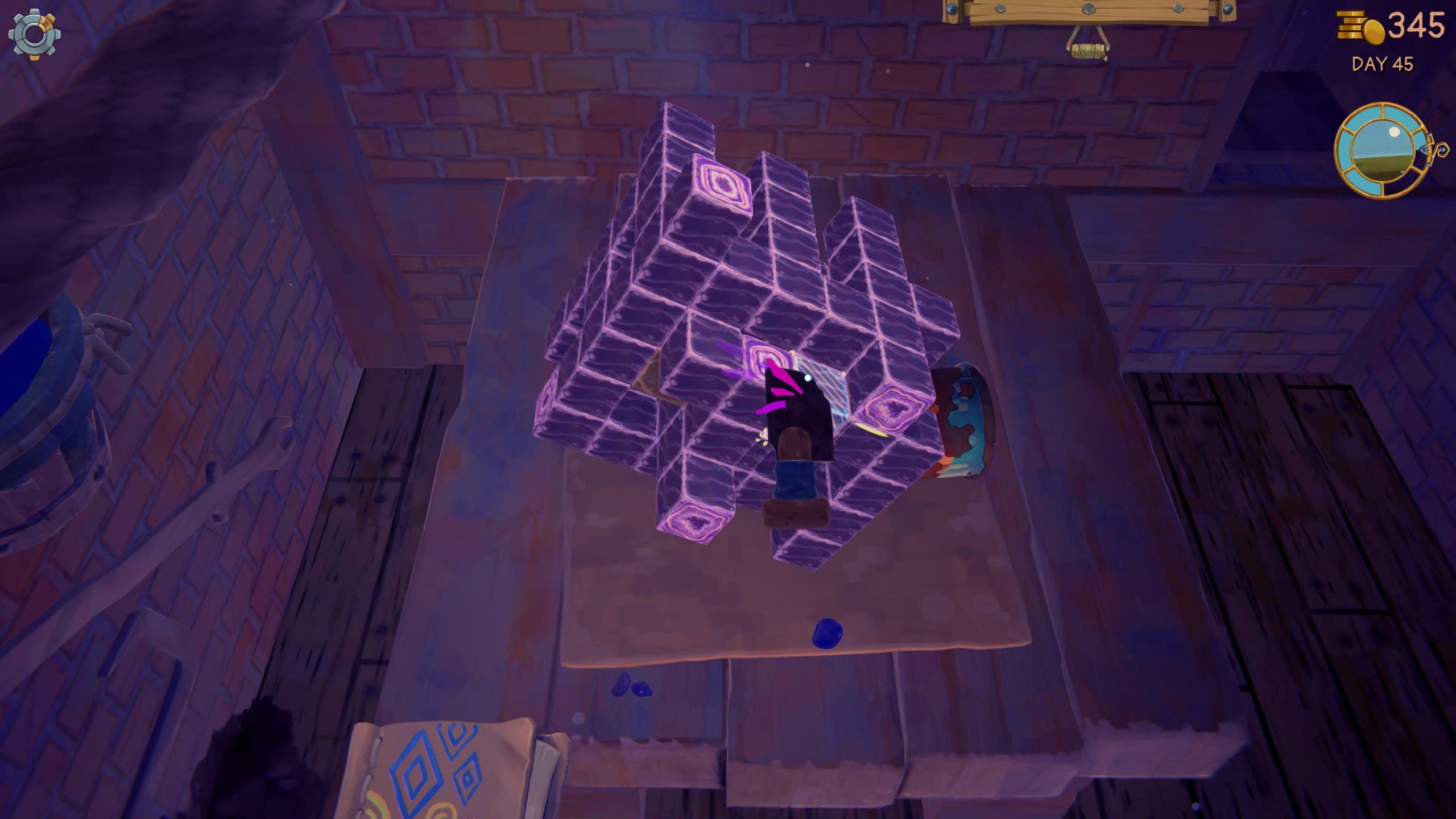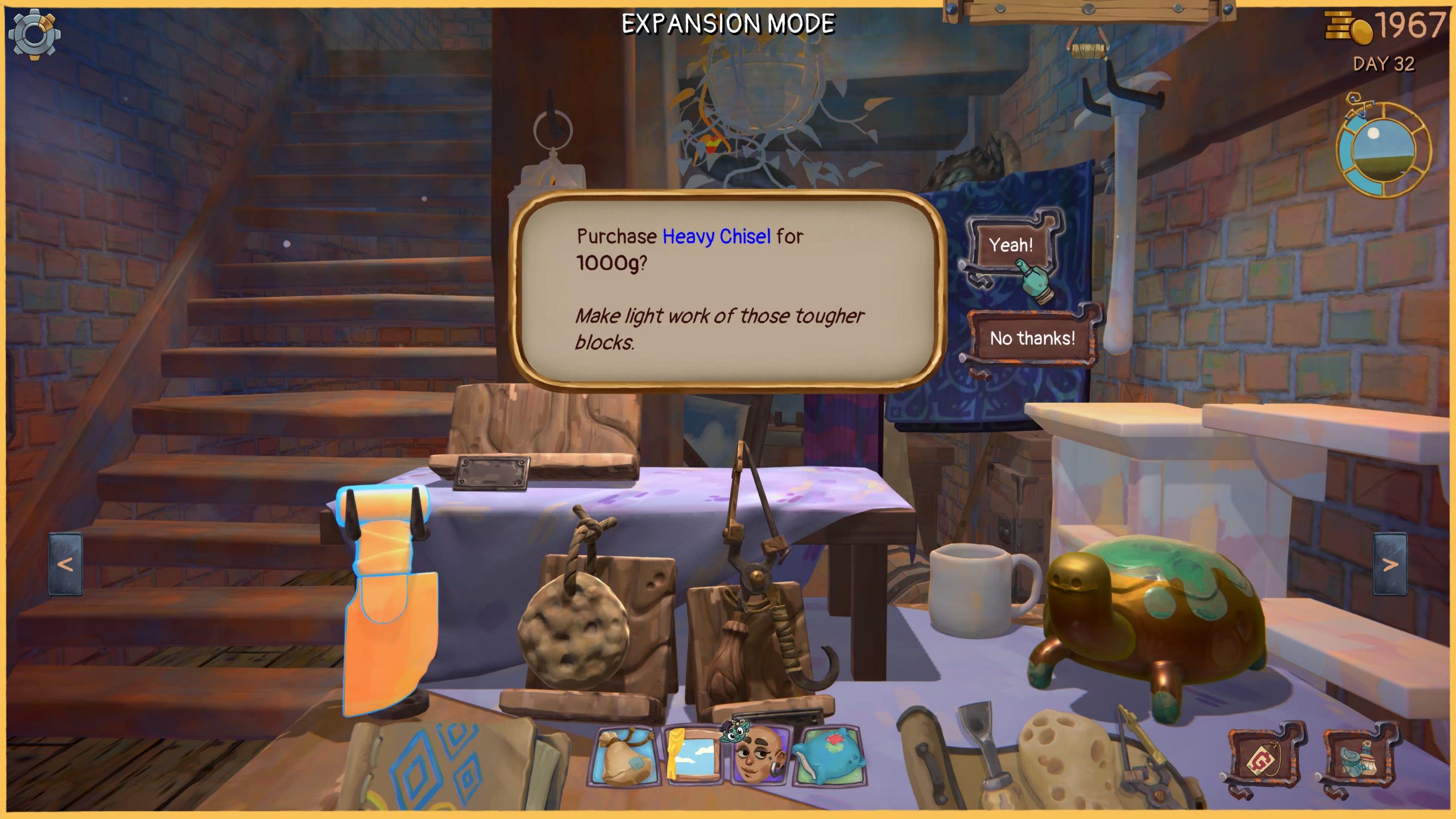 The main area is the workshop. Here you’ll receive packages which you’ll break open with your chisel. Initially, these show up as collections of blocks, kind of like something out of Minecraft. However, your chisel can take off all of these rough edges (there are different types of blocks that take more or fewer hits), and eventually you’ll be left with an item that is almost ready to sell.